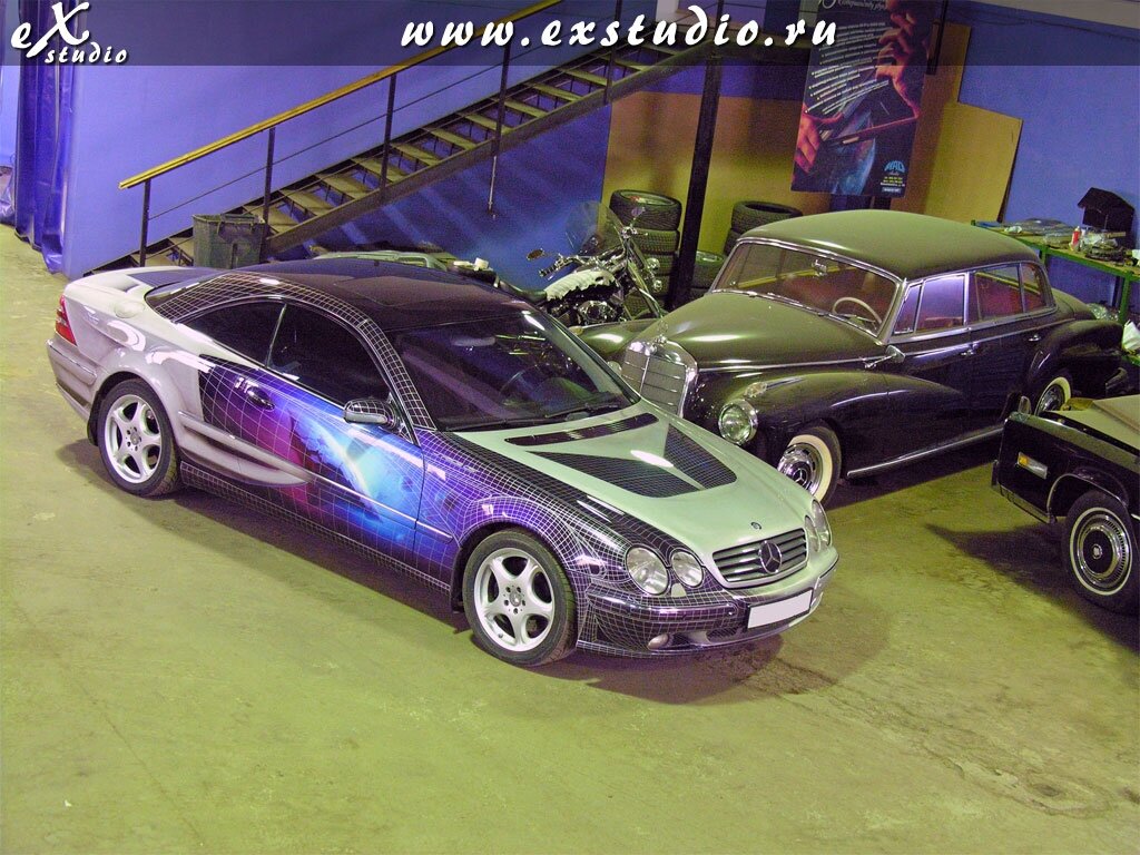 Владелец Мерседеса CL215 хотел внести в престижный автомобиль несколько штрихов, чтобы подчеркнуть строгие формы кузова. Не имея четкого представления о будущем рисунке, клиенту было предложено выполнить аэрографию, которая содержит в себе художественный рисунок с элементами абстракции. Если рассматривать автомобиль спереди или сзади, то вроде ничего необычного нет, а рисунок в виде тоненькой сеточки скорее похож на естественное лакокрасочное покрытие спортивного автомобиля. А вот присмотревшись вблизи на кузов машины, будет уже казаться, что мы проникли в «кибер мир» и перед нами находятся контуры автомобиля, начерченного сложной графической программой. Совсем другой вид открывается с правой стороны, здесь цифровой мир постепенно отступает перед безмятежной вселенной, пробивающийся свет от далекой планеты позволяет увидеть медленно летящие астероиды. С помощью аэрографии металл принимает фантастические формы, что больше напоминает космический корабль, нежели простой автом
