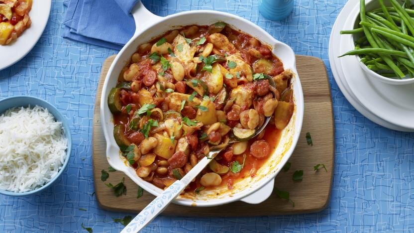 Эта удовлетворительная и вкусная еда также является удивительно здоровой и подходит как ужин для тех, кто следит за диетой в 1200-1500 калорий в день. Ингредиенты метод Нагрейте масло в большой, антипригарной сковороде или сковороде. Добавьте курицу и приправьте перцем. Обжарить в течение 2 минут, регулярно помешивая. Перенесите цыпленка на тарелку с помощью щелевой ложки или шпателя и добавьте лук, перец, кабачок и чоризо к кастрюле. Обжарьте на среднем огне в течение 3 минут, регулярно помешивая Добавьте вино, помидоры, масляные бобы, томатное пюре, орегано, хлопья чили и кусочек куриного бульона в кастрюлю. Заполните томатный олово холодной водой, вылейте в томатную смесь и перемешайте. Приправьте немного соли и перца. Принесите соус до кипения, верните цыпленка на сковородку и кипите в течение 8-10 минут, или пока курица не станет мягкой и приготовленной, и соус утолтится. Между тем, наполовину наполните большую кастрюлю водой и доведите до кипения. Добавьте рис