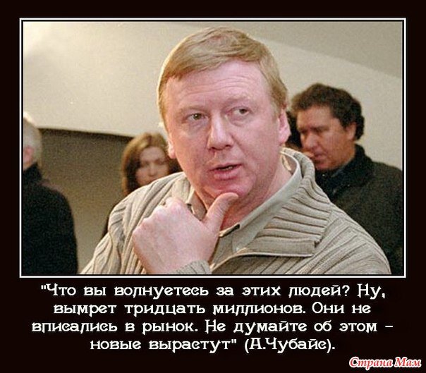 Хочется спросить чубайсов, медведевых, кудриных и прочих либералов, говоривших в 90-е о том, что нет ничего плохого если вымрут 30 миллионов человек: «А чего это Вы господа теперь вдруг вопите о демографическом кризисе?»