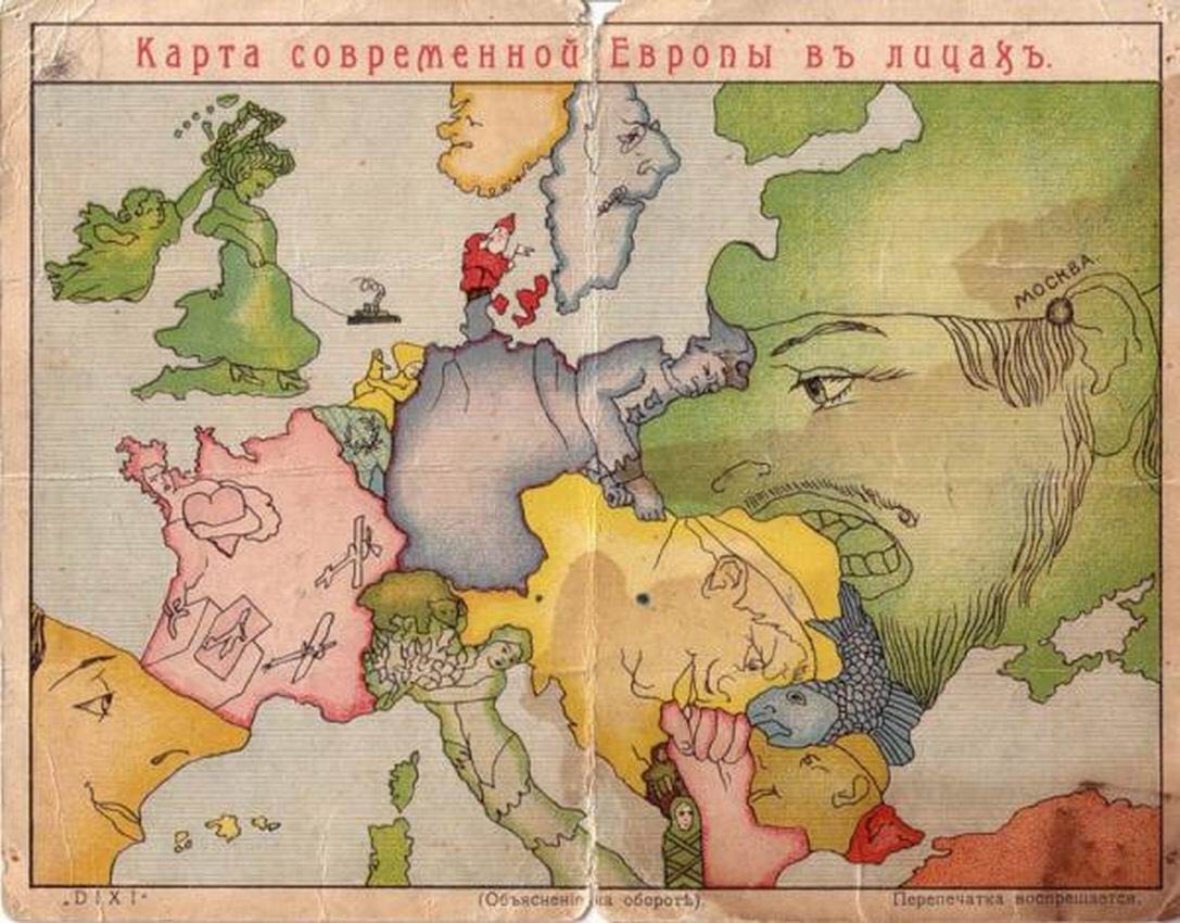 Люди давно заметили, что контуры стран напоминают разные предметы, людей, животных и так далее. Символические карты рисовались с незапамятных времён, но в начале ХХ века получили дикую популярность в качестве инструмента пропаганды. Поиск по фразе "serio-comical maps" выдаст кучу результатов, попробуйте на досуге. А у нас мини-обзор сатирических карт Европы столетней давности. Начнём не с самой красивой, но зато отечественной. Художник, как смог, отработал темник, отправленный из Зимнего в 1914 году :) Поэт от него не отставал, всё тут по методичке: "Хоть размером с пятачок, крепок сербский кулачок. Черногорцы, бросив жён, лезут тоже на рожон. Только хитренький болгарин австрияку благодарен". В общем-то, расстановка сил на Балканах отражена верно. Неплохо разложен и русско-германский конфликт: