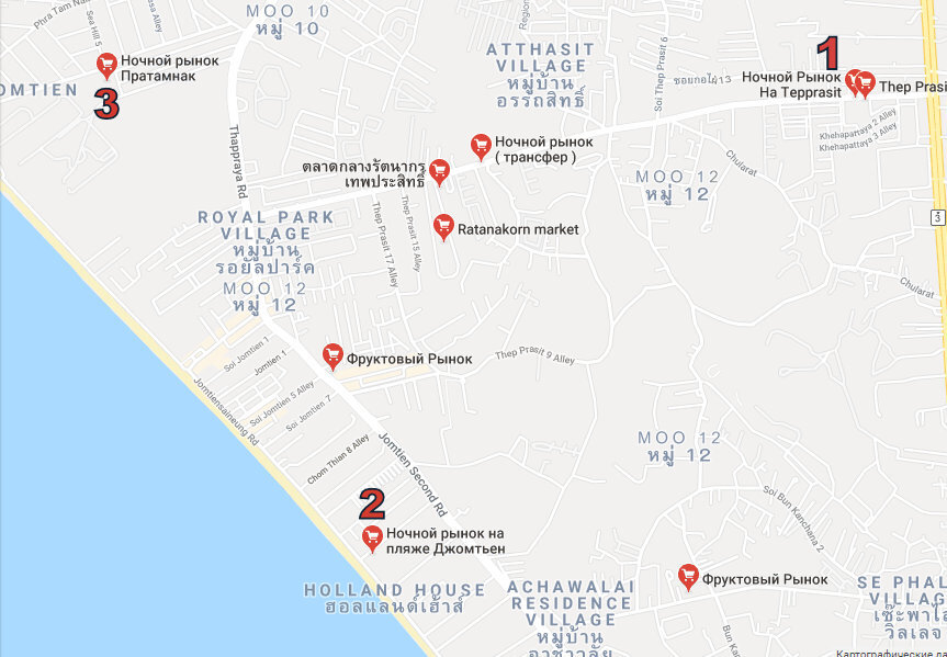 В Паттайе множество рынков развалов и так называемых кочующих ярмарок. Каждый для себя там сможет найти все что угодно будь то сувениры, косметика, одежда и обувь! Хочу Вам рассказать про одни из самых посещаемых этих мест в районе Джомтиен. 1. Ночной рынок Тепразит Найт Маркет, Пт.Сб.Вс. 17:00 до 23:00. Одежда, обувь,косметика, бижутерия, и тд. Так же на рынке есть место где вы сможете отведать настоящую тайскую кухню начиная от традиционных блюд заканчивая насекомыми))))) 2. Ночной рынок на пляже Джомтиен, работает каждый день с заката до полуночи. На этом рынке присутствует тот же набор товаров! Только вот есть небольшое преимущество на этом рынке вы сможете отведать Русскую кухню и блюда адаптированные для европейцев! Рядом присутствует множество маленьких БАРчиков а так же волейбольная площадка на пляже и детский городок !!! 3. Ночной рынок на улице Паттайя Парк, улицу еще называют Русской из за обилие Русских кафе, турфирм и отелей! На рынке под чти все тоже самое но так же