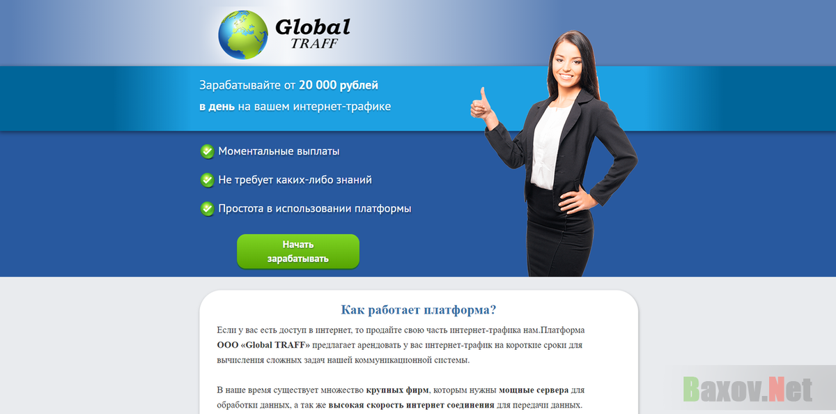 Таких лохотронов, как Global TRAFF, достаточно много. Все они созданы с целью обокрасть карманы простачков. Не следует думать, что нашлись добрые дяденьки, которые хотят отдать месячную зарплату только за использование компьютера. Если бы все так было просто, многие давно уволились бы с обычной работы. А пока люди предоставляют обычные услуги, значит, халявы еще не появилось.