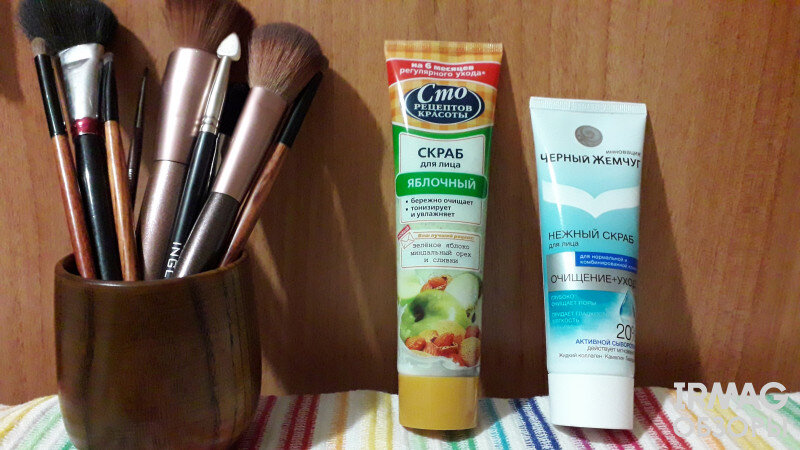 Продолжаем разговор. Кто о чем, а я опять о скрабах. Шлифование эпидермиса любимое занятие во время водных процедур, поэтому не могу сохранять равнодушие и спокойствие рядом с новыми баночками. В первой части уже наметился любимчик, посмотрим, может ли кто-то сдвинуть его с лидерского пьедестала. Среди претендентов на занятие почетного места в моем сердце и на полочке в ванной комнате: Скраб для лица Черный Жемчуг BIO-Программа Мягкий (80 мл) и Скраб для лица Сто рецептов красоты Яблочный (100 мл). Последний привлек меня ярким флаконом и очень вкусной картинкой. Мгновенно внутри ощутила пользу и аромат зеленых яблок и сладкого миндаля. Не сразу сообразила причем здесь миндаль, но после прояснилось. С обратной стороны тубы приводится рецепт домашнего скраба. Пюре зеленого яблока, 2 ч.л. миндальных орехов смешивается с 1 ч.л. натурального йогурта. Уже зах