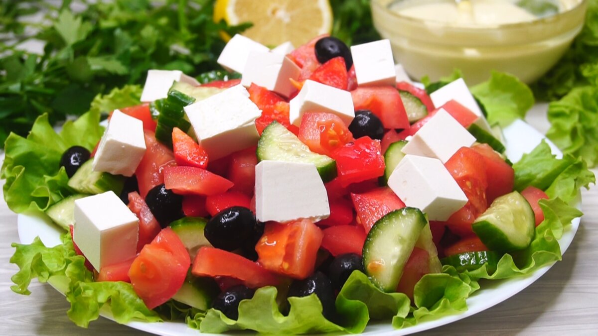 Греческий салат. Получается Необыкновенно вкусный. Секрет здесь в особой заправке, которая придает ему восхитительный вкус и аромат.