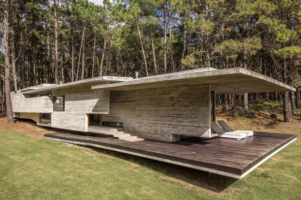 Недалеко от Буэнос-Айреса находится частное владение Costa Esmeralda. Территория густо поросла акациями, соснами и другими деревьями — ландшафт умиротворяющий и впечатляющий. Именно там хозяева участка решили построить себе дом, но сделать это с минимальным уроном для окружающей среды. За проектирование взялось архитектурное бюро Besonías Almeida Arquitectos. Сложность заключалась в том, что участок находится на гористой местности, поэтому архитекторы предложили спроектировать дом из трех модулей, размещенных на разных уровнях. Такая ступенчатая конструкция не только позволила решить проблему с перепадом высот, но и создала уникальный визуальный облик сооружения. В пространстве дома разместились кухня, две спальни, одна гостевая спальня, а также комната, используемая как аудиовизуальная студия. Архитекторы также учли пожелания семьи и спроектировали открытую террасу с грилем. Практически вся конструкция дома выполнена из бетона, но архитекторы решили идти дальше и спроектировали