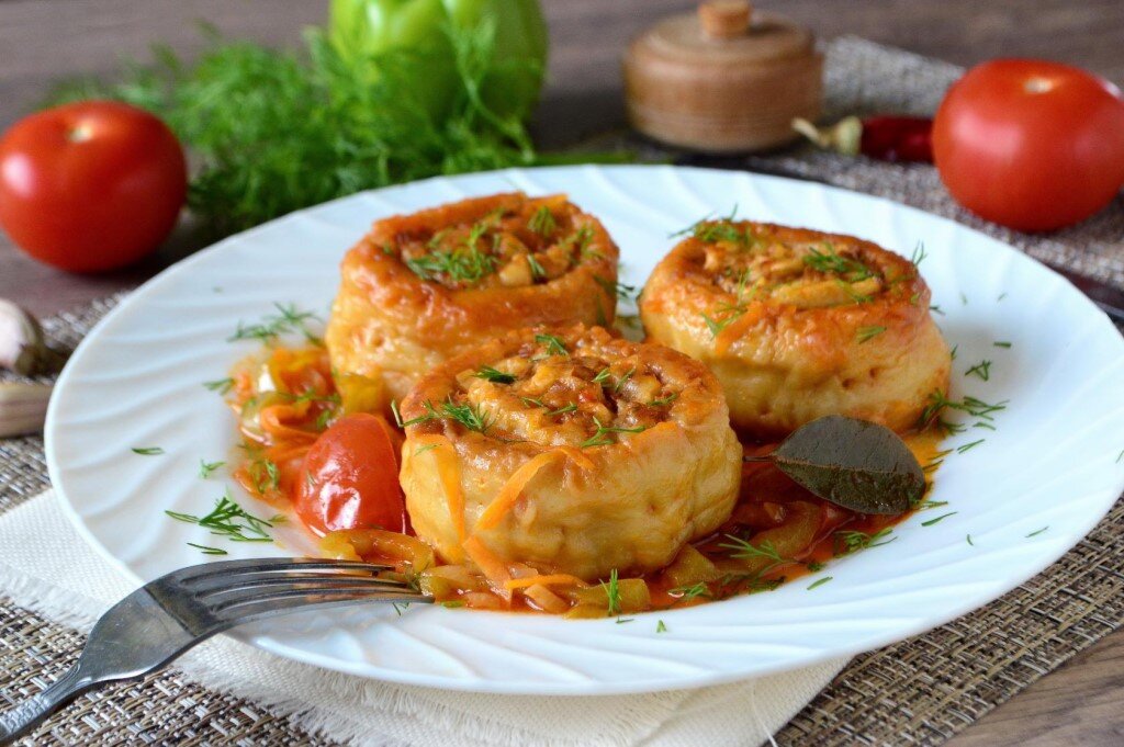 Штромбы. Замесить пельменное тесто: в 250 гр. стакане взбить 2 яйца, долить до верху кипячёной водой и вылить в миску. всыпать 1 ст.л. (без верха) соли и, подсыпая постепенно просеянную муку, замесить тесто "как на пельмени). Муки брать столько, сколько возьмёт тесто. Завернуть в плёнку и отложить-пусть "отдохнёт". Приготовить фарш: 500 гр. свинины с сальцем прокрутить на мясорубке два раза (сквозь мелкую решётку). Можно взять готовый фарш. Одну луковицу и одну морковь потереть на мелкой тёрке, обжарить на подсолнечном масле и добавить в фарш. Посолить, поперчить, добавить любимые специи и хорошо перемешать. Влить кипячёной воды комнатной температуры столько, чтобы фарш получился консистенции не густой сметаны (чтобы его можно было намазывать на тесто). Делаем подливу: одну, нарезанную тонкими полукольцами луковицу и одну, тёртую на крупной тёрке морковь пожарить в сковороде на растительном масле. Добавить томатный соус или кетчуп по вкусу, посолить, поперчить и потушить 2 минуты. При