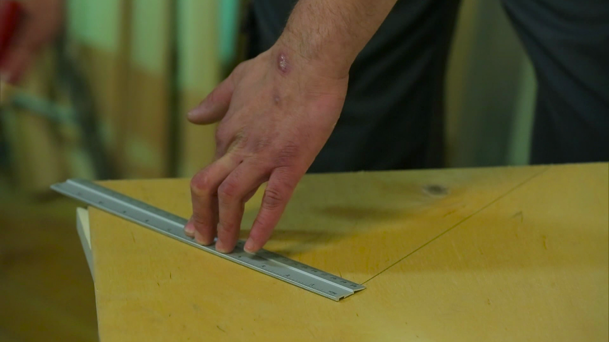 На листе фанеры с заводским запилом начертить равносторонний треугольник со стороной около 30 сантиметров.