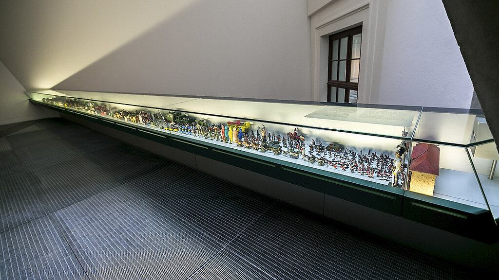 Эта витрина посвящена детским игрушкам на военную тему разных стран и эпох.