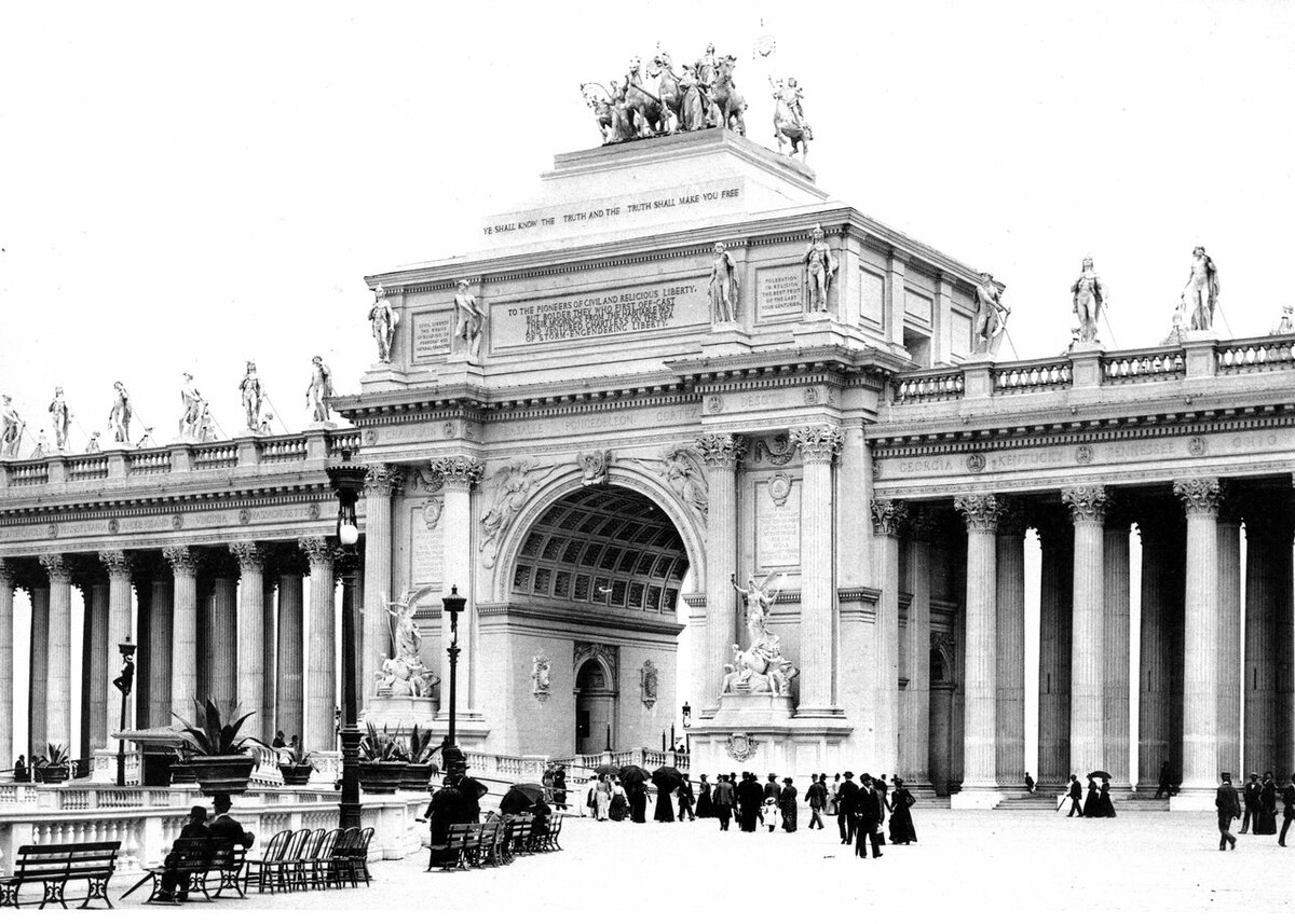 Наверное самая странная из серии мировых выставок прошла в 1883 году в Чикаго. Если остальным можно при сильной заинтересованности, приписать официальную историю и закрыв глаза в нее поверить, то здесь уже никак не получается - остаются вопросы. Даже с закрытыми глазами и слепой верой. Для начала , можно посмотреть , какая о ней сохранилась информация: Официально считается, что кроме Дворца Изящных Искусств остальные здания, в той или иной мере копии, потому как оригиналы были слишком ветхими. Как вы наверное догадались, все было сделано из гипса и штукатурки. Ниже на фотографиях, фонтаны, вода и огненные факелы на фасадах домов. Не кажется ли вам, что все перечисленное не сильно совместимо с жизненными принципами гипса и штукатурки. Как и на остальных выставках, все было выстроено в кратчайшие сроки - в районе трех лет. простояло сезон и было уничтожено. Как и остальные выставки Чикагская была мега успешна в финансовом плане. Более того, ее посетило 27 млн человек. Осталось только