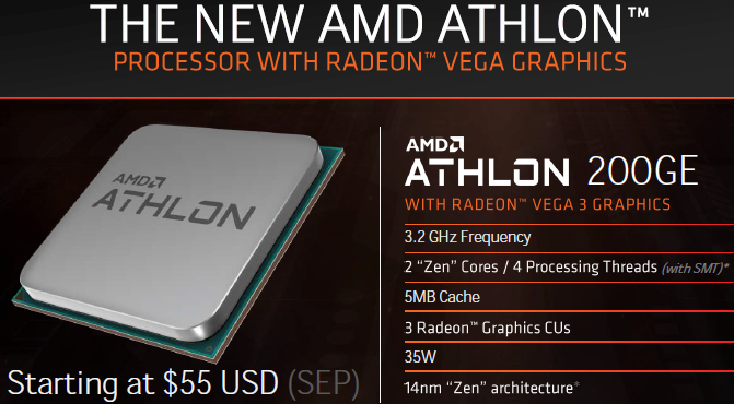 Долго время Pentium G4560 или Гиперпень был идеальным решением для сверхбюджетного гейминга, офисного или домашнего пк, но время идет и AMD представила достойную альтернативу на сокете AM4 - Ryzen Athlon 200GE. Цена новинки составляет 55$, что на 9$ (!!!) меньше конкурента :D Как можно увидеть, новинка обзавелась двумя полноценными ядрами с технологией SMT, что дает 4 потока в общем. За минус можно считать использование архитектуры "Zen", а не "Zen+". С другой стороны, AMD вынуждены куда-то использовать остатки кристаллов. Тепловыделение ниже, чем у того же Гиперпня (54W vs 35W), но по производительности совсем не уступает конкуренту. Встроенная в новинку графика "Radeon Vega 3" показывает превосходные результаты и с лихвой обгоняет Pentium G4560, давая возможность играть в нетребовательные сетевые проекты с 60 кадрами в разрешении 720р. Сверхбюджетный гейминг, как ни как. Огромный плюс в том, что систему на Ryzen Athlon 200GE можно легко улучшить в недалеком будущем на более производи