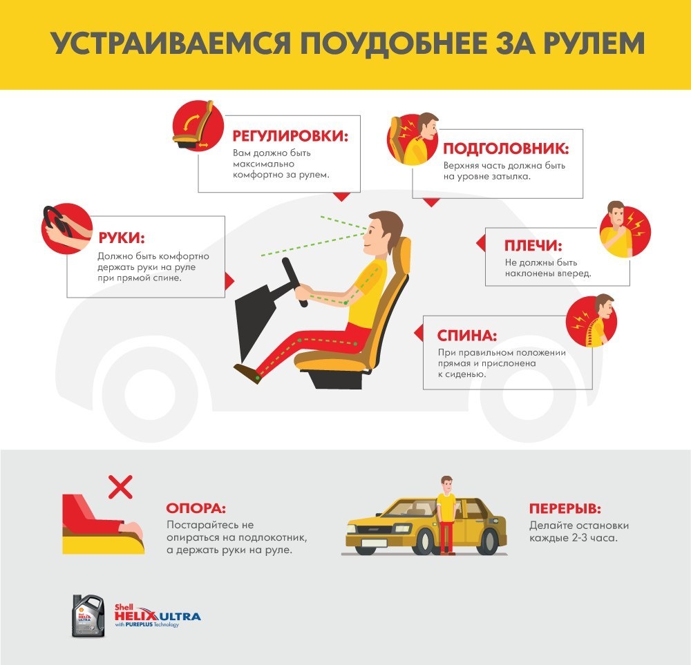 В теплое время года мы часто проводим помногу времени за рулем во время поездок за город или автомобильных путешествиях. Кроме того, что это нагрузка для машины, старайтесь не забывать о том, что длительное вождение – непростая задача для организма. Мы подготовили несколько советов, как меньше уставать за рулем: УСТРАИВАЕМСЯ ПОУДОБНЕЕ ЗА РУЛЕМ