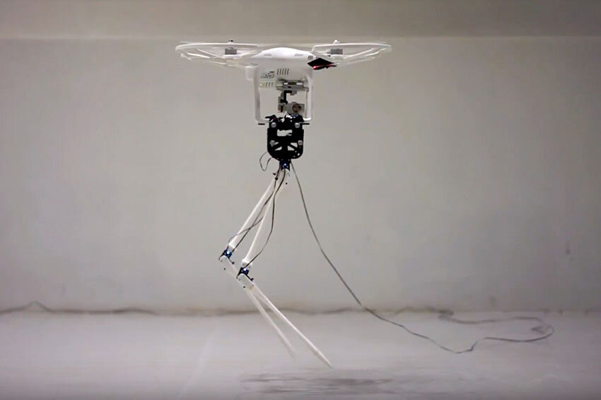 Инженеры Токийского университета создали робота под названием Aerial-Biped. Особенность изобретения в том, что у конструкции две опоры-ноги, а передвигается механизм при помощи квадрокоптера. Известно, что уязвимость роботов на двух ногах заключается в том, что им сложно удерживать равновесие во время движения. Чтобы преодолеть это препятствие, сотрудники университета Токио снабдили созданный ими проект Aerial-Biped беспилотником. Инженеры объяснили, что особый алгоритм позволяет контролировать скорость летательного аппарата и управлять конечностями механизма с встроенными сервомоторами. Главная задача системы – уменьшать скорость ноги при контакте с поверхностью, в идеале она должна быть равна нулю. Скорость измеряется посредством внешней стационарной системы, поэтому пока робот способен функционировать лишь в помещении, где находится оборудование. Главный разработчик А. Маэкава сообщил, что пока Aerial-Biped находится на стадии прототипирования. Инженеры не строят больших надежд по