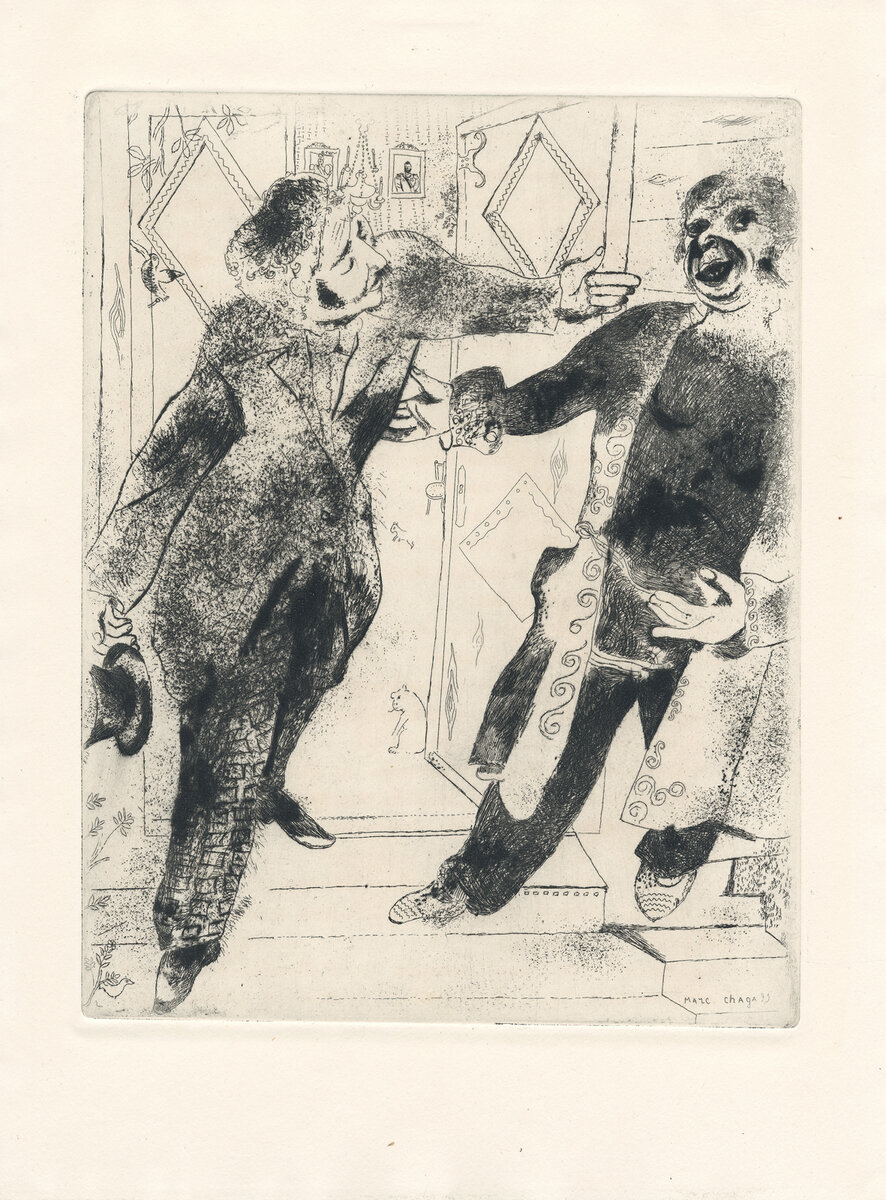 Иллюстрации к этому произведению создал российско-французский художник Марк Захарович Шагал. В 1923 году к Шагалу обратился известный французский меценат Амбруаз Воллар с предложением издать иллюстрированную версию приключений Чичикова. Тираж был напечатан и издан в Париже, к сожалению книга не пользовалась популярностью, и расстроенный Шагал отправил все офорты в московскую Третьяковку, подписав: «Дарю Третьяковской галерее со всей моей любовью русского художника к своей родине эту серию из 96 гравюр, сделанных мною в 1923–25 гг. к «Мертвым душам» Гоголя для издателя Ambroise Vollard в Париже». Позже, в 1948 году права на иллюстрации выкупил другой французский издатель Эжент Третьярд. Он повторно издал лимитированный тираж книги, для музеев, библиотек и коллекционеров. На этот раз работы были приняты читателями с восторгом, а издание получило Гран-при на Венецианском Биеналле.