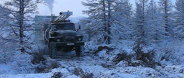 Суровая в тот год была зима. Мороз под 40 и каждый день. Хорошо, что ветра при таком морозе не бывает и от этого холод переносится легче. По рации как то раз ребята сейсмики предупредили, что наш тракторенок, укатывающий профиль, продавил лед на таком то профиле на таком то пикете и провалился. Утонул. Просят, чтобы мы на ГТТ (гусеничный тяжелый тягач) подъехали и вытащили трактор. Это где-то км 12 от нас. Пока водитель заводил тягач и прогревал, я приготовил трос на 6, на 12 мм и различной длины. Приготовил горячий чай для тракториста в термосе. Поехали. У наших ГТТ как обычно печки не работали почему то. И я как штурман на пассажирском месте всегда ездил в обнимку с двигателем. Тепло. А чтобы было ещё теплее мы обычно защитный кожух движка снимали. Так грелись. Нужно было быстрее доехать до нашего тракториста. Холод собачий , а он на морозе. Летом, когда выносили профили на местность нашли мы короткую дорогу - просеку свежую под ЛЭП, видимо, подготовленную - вот по ней и помча