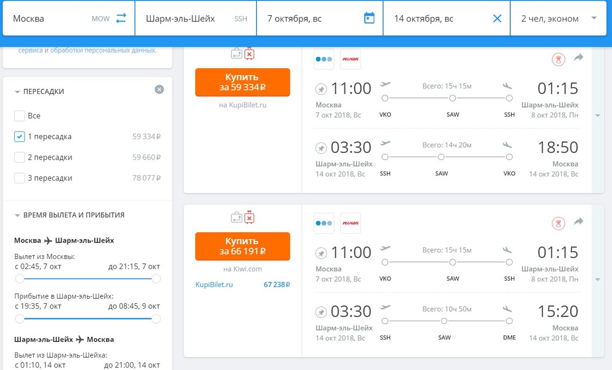 Вот уже несколько лет на любимые россиянами курорты Египта закрыто прямое авиасообщение. Буквально каждый месяц появляется информация о скорейшем возвращении чартеров в Хургаду и Шарм-эль-Шейх. Туроператоры объявили о готовности организовать отправку российских туристов на курорты в течение недели после разрешения Правительством чартерной перевозки. Истинные поклонники давно нашли обходные пути и летают в Хургаду и Шарм-эль-Шейх через Белоруссию и Турцию. Давайте посчитаем, во что обойдется такая поездка для 2 взрослых. Итак, хочу улететь через месяц в Шарм на неделю. АВИАБИЛЕТЫ Без пересадки не обойтись. Оптимальный вариант- перелет через Турцию с посадкой в Стамбуле. От времени ожидания в транзитном аэропорту зависит стоимость. Самый дешевый билет с 8 часовым ожиданием в Стамбуле будет стоить 29.7 тыс.руб. на чел., за двоих 59.4 тыс.руб. (aviasales.ru). В эту стоимость не входит провоз багажа. За багаж до 10 кг нужно будет доплатить примерно 4 тыс. руб., за 20 кг - 7 тыс. руб. ПР