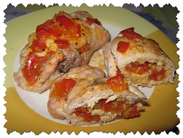 5. Заворачиваем в куриное филе, тушенные овощи и закалываем зубочистками