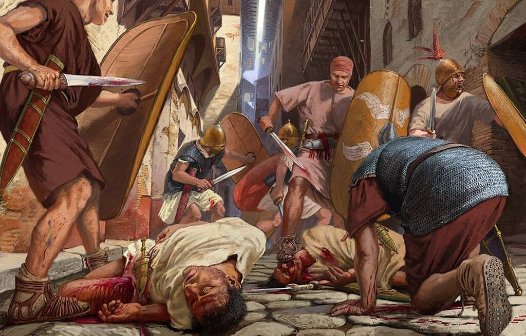 Проще найти человека, который по своей воле пойдет на смерть, нежели того, кто терпеливо вынесет все лишения. - речь арверна Критогната в осажденной Цезарем Алезии (Caesar, BG, VII.77) Вашему вниманию предлагается подборка из шикарных артов, где авторы постарались изобразить жестокость вооруженных столкновений. Все авторы довольно известные, с немалым опытом сотрудничества с крупными издательствами. Марианцы против cулланцев, 88-87 годы Легионеры знаменитого полководца-реформатора Гая Мария сражаются со сторонниками консула Суллы на улицах Рима в ходе Гражданской войны. Иллюстратор: Radu Oltean Схватка латников в битве при Азенкуре, 1415 год Знаменитое избиение французов английскими спешенными рыцарями и лучниками. Обессиленные рыцари падали в грязь, оказывались затоптанными воинами обеих сторон. Хронист сообщает о горах трупов с рост человека. Иллюстратор: Milek Jakubiec Битва у Граупийских гор, 83 год Битва произошла на территории современной Шотландии: римские войска полководца А