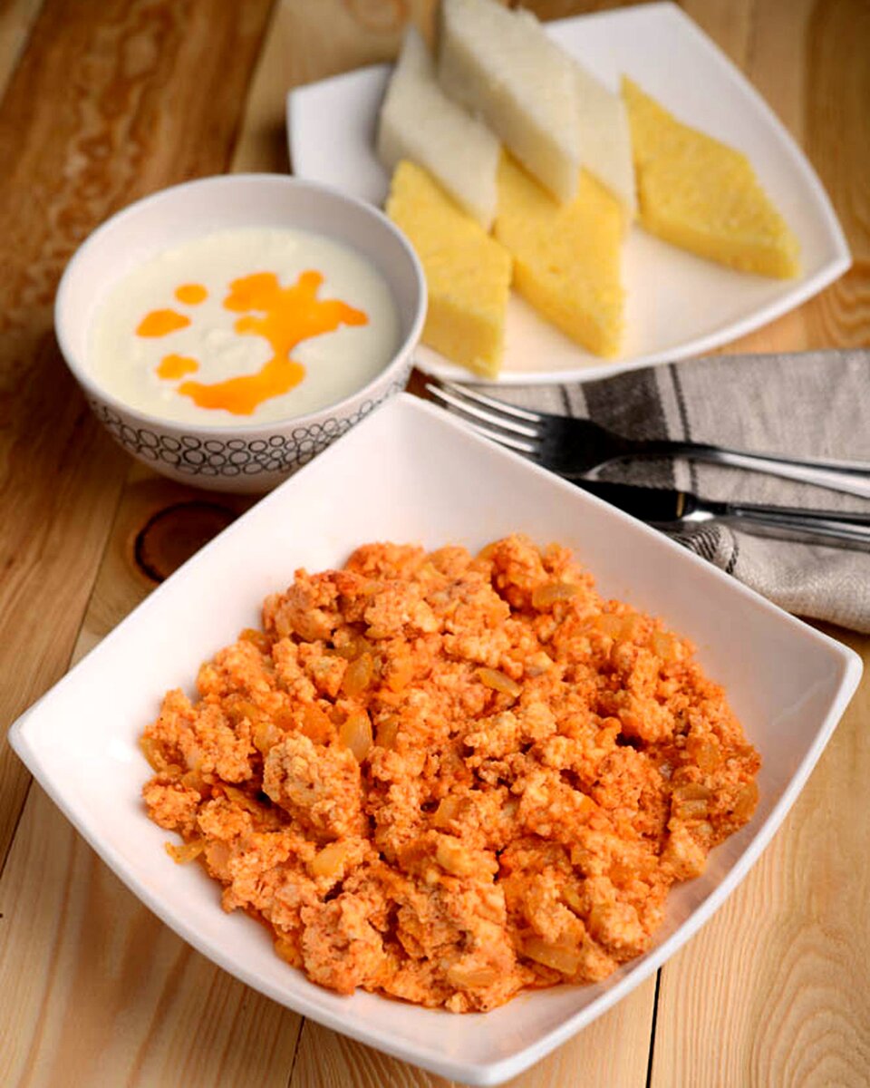Это вкусное и питательное блюдо быстрого приготовления. Обжарить на сливочном масле в сковороде измельченный репчатый лук и молотый красный сладкий перец. Добавить крошеный руками свежий сыр, перемешать и обжарить еще 2–3 минуты. Сразу же подать на стол в горячем виде, желательно в той же сковороде, посыпав зеленью кинзы или зеленым луком. Можно использовать для зажарки не репчатый, а зеленый лук – в этом случае важно его не пережарить, чтобы лук не потерял свой цвет. Важно также не пережарить молотый перец, чтобы он не пригорел – лучше добавлять его в зажарку в самом конце, перед закладкой сыра. Некоторые посыпают перцем уже готовое блюдо, но в этом случае сыр и зажарка не успевают окраситься красным и блюдо не получает необходимого привлекательного вида. На 500 г сыра 300 г сливочного масла, перец и соль по вкусу.