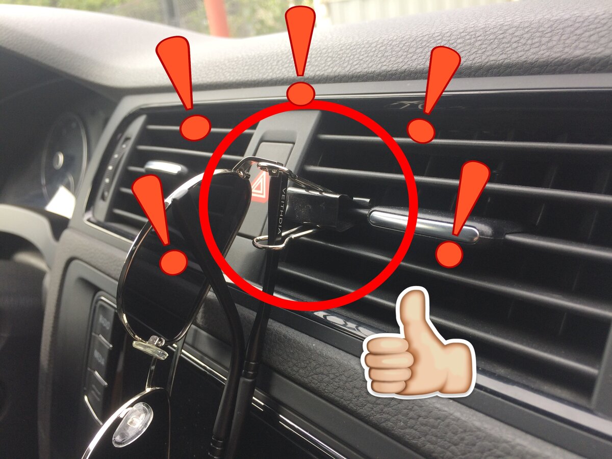 Здравствуйте! Сегодня я подобрал очередную подборку полезных советов для автовладельцев и хочу поделиться ею с вами! Как обычно это не сложные и дешёвые решения, которые помогут вам в повседневной эксплуатации вашего автомобиля! И первое отличное решение для тех кто любит или вынужден ездить за рулём автомобиля в солнцезащитных очках! Как известно не всегда в автомобиле есть специально оборудованный очёчник. И порой очки не куда положить. Когда, например, нет каких-то кармашков куда можно было бы их положить. А если класть очки на панель, они могут слетать на поворотах, при старте или при торможении. Превосходным решение для хранения очков под рукой будет обычный металлический зажим для бумаги. Всё что нужно сделать это прицепить его к створкам воздуховода в салоне. А очки можно повесить продев в металлические ручки этого зажима. Благодаря этому не хитрому и бюджетному решению очки надёжно зафиксированы и будут всегда у вас под рукой. Второй совет! Я думаю огромное количество водител