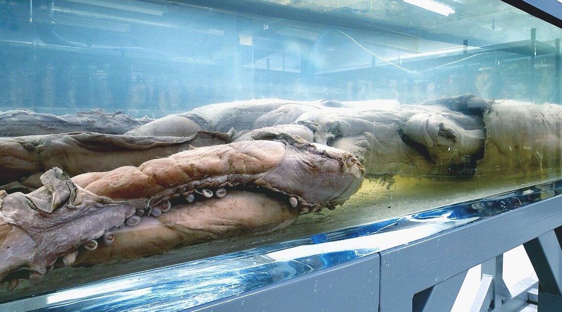 Гигантский кальмар или Архитеутис остается в значительной степени загадкой для ученых, несмотря на то, что является самым большим беспозвоночным на Земле. Эти неуловимые гиганты глубинного мира могут достигать в длину около 8 метров. Самый большой из десятируких головоногих моллюсков когда-либо найденных, был около 18 метров в длину и весил почти тонну. Неуловимый гигант Негостеприимная глубоководная среда обитания гигантского кальмара, сделала свое дело. И долгое время ученые знали о них самую малость. Довольствуясь лишь выброшенными на сушу, либо доставленными рыбаками огромными тушами. Однако в последнее время, в научной среде был сделан значительный прорыв. В 2004 году исследователи в Японии сделали первые снимки живого гигантского кальмара в их естественной среде. А в конце 2006 года ученые из Национального научного музея Японии поймали и вывели на поверхность живую 16 - метровую самку гигантского кальмара.