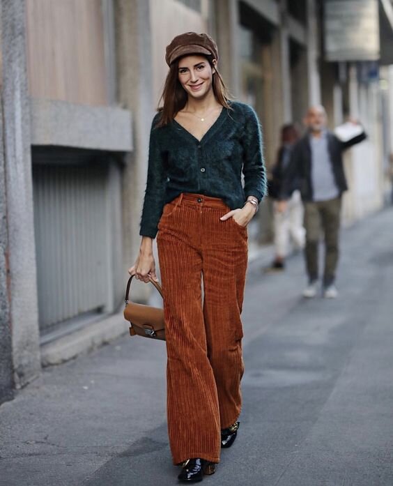 - Ретро-лук: Расклешенные брюки или брюки-марлен из вельвета являются идеальной основой для аутентичного ретро-лука конца 60-х и 70-х годов. Проживите это в полной мере и скомбинируйте к ним пуловер с воротником гольф или рубашку с пуговицами на планке, ботинками на платформе и кепкой, золотым украшением и блузами с рисунком пейсли.