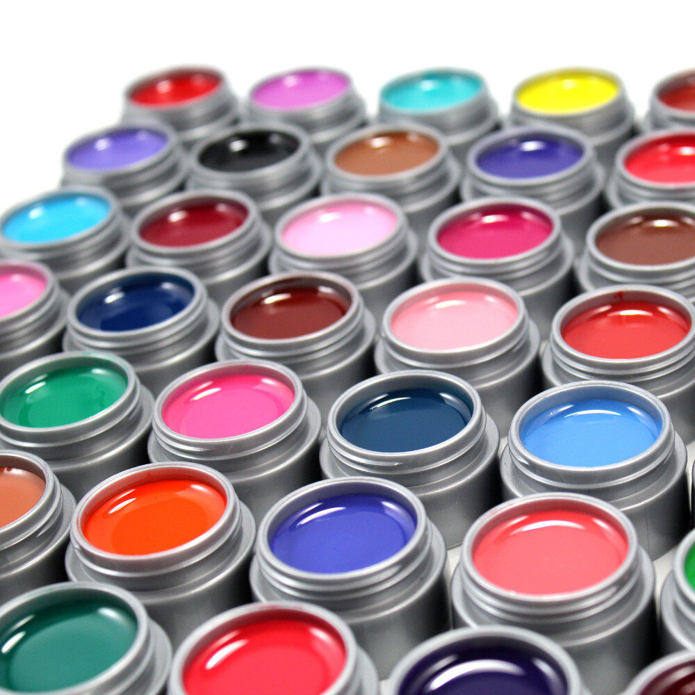 Несколько лет назад в обиходе у мастеров был цветной гель. Он имеют схожую консистенцию с краской. По сути, — это гель, который смешивается с определённым цветным пигментом. Но этот самый пигмент имеет особенность оседать на дне баночки. Для этого при каждом нанесении необходимо его хорошо перемешивать. Гель ложится на ноготь тонким слоем, но цвет у него слабо проявляется. Цветной гель требует подложки.