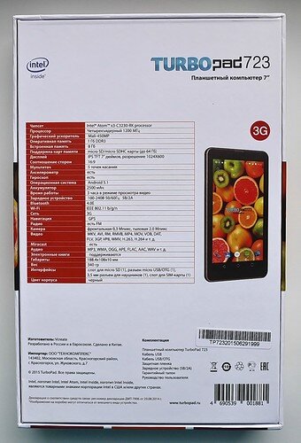 Планшет поставляется в белой аккуратной коробочке, на задней стороне коробки можно ознакомится с техническими характеристиками устройства.