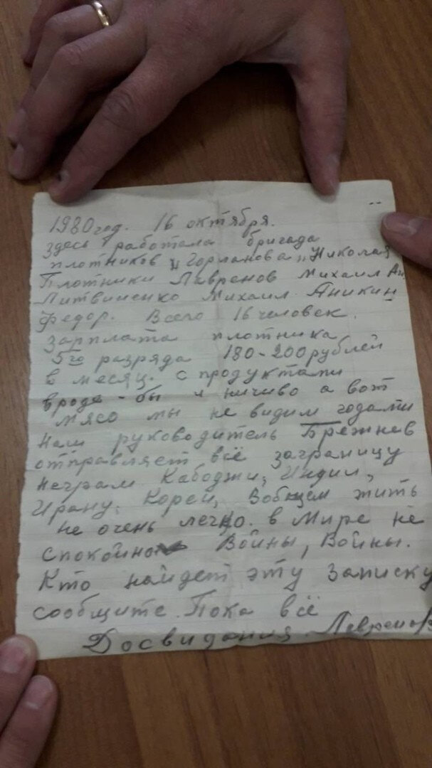 Во время ремонта в родильном доме областной челябинской больницы № 3 рабочие обнаружили в дверном косяке бутылку из-под водки с запиской. Авторы письма утверждают, что обращаются к потомкам из 1980 года, и жалуются на тяжёлые условия жизни. Потомкам они рассказали о себе: о небольшой зарплате в 180-200 рублей (примерно соответствует современной зарплате плотников), о том, что в мире неспокойно. —С продуктами вроде бы и ничего, а вот мясо мы не видим годами. Наш руководитель Брежнев отправляет всё за границу... В общем, жить не очень легко, — написали плотники. вот так можно еще найти все что угодно.