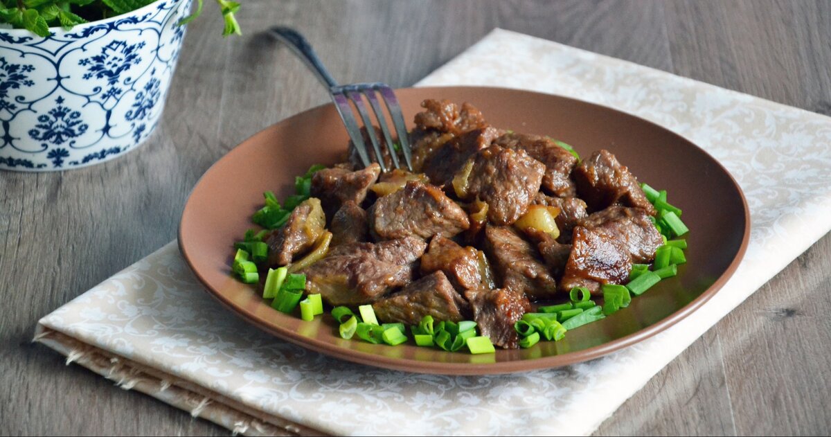 Говядина "Испанка". Этим рецептом поделилась соседка, у которой дочь живёт в Испании. Готовится очень легко, а вкус просто изумительный. Продукты: 1 кг. молодой говядины (вырезка), 1 бутылка 0,7 л. сухого красного вина, 4-5 головок репчатого лука, соль и перец по вкусу, растительное масло (без запаха) для жарки. Приготовление: Мясо нарезать поперёк волокон небольшими кусочками, посолить и поперчить. Сковородку с растительным маслом очень хорошо нагреть. Мясо 5-7 минут обжарить в масле, добавить вино, довести до кипения, убавить огонь и кипятить пока вся жидкость не испарится. Теперь добавляем лук, порезанный толстыми кольцами и жарим до готовности. Попробуйте, не пожалеете! Приятного аппетита!!! Говядина "Чарующий аромат". Нам понадобится: 700 гр. молодой говядины, 2 луковицы репчатого лука, 1 крупная морковь, 1 красный болгарский перец, 2 кислых яблока (типа антоновки), любой готовый бульон (можно из кубика), соль, перец и любимые приправы по вкусу. Готовим: мясо порезать порционными