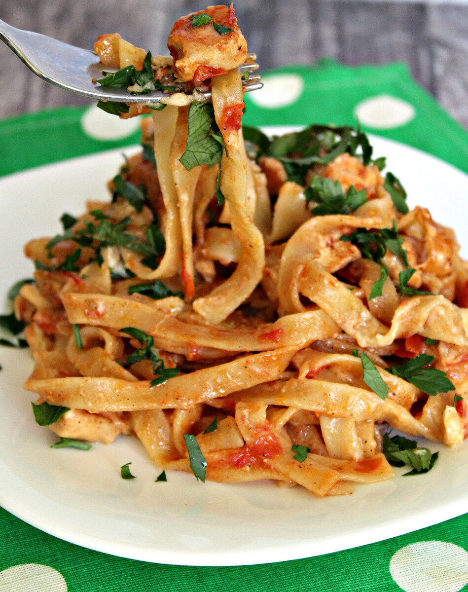 Куриное филе порезать кубиками примерно 2*2 см Помидоры порезать как можно мельче. Глубокую сковородку смазать маслом, хорошо нагреть и выложить на нее куриное филе. Жарить на сильном огне буквально 5 мин, пока кусочки не зарумянятся. Добавить помидоры и прожарить их вместе с филе до тех пор, пока не испарится с них вся жидкость и они тоже не начнут зажариваться. Далее выкладываем в сковородку любые сырые макаронные изделия (рожки, перья, улитки, спагетти - любые на ваш вкус). Добавляем воду, солим перчим по вкусу, все перемешиваем, накрываем крышкой и ставим на самый маленький огонь. Пока готовятся макароны, на другой сковородке будем делать соус. Для этого нужно растопить кусочек сливочного масла. Когда масло растопится, добавить