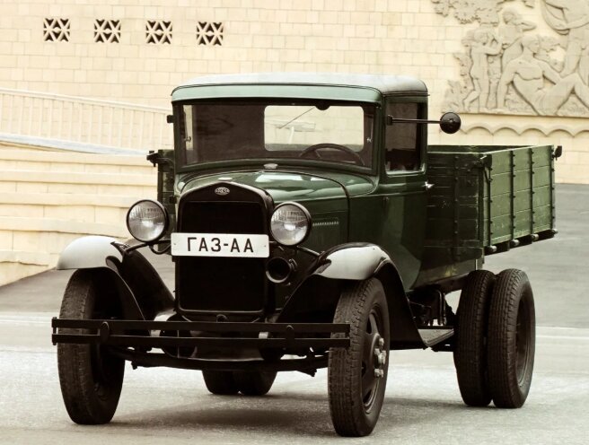 Газ АА или как её называли в народе «полуторка», начало серийного производства 1932 год, за основу этого грузовика взяли американскую машину форд. Этот автомобиль принимал участие в Великой Отечественной Войне и по праву может называться «Автомобиль победы».