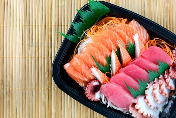 Ингредиенты: Филе тунца свежего - 400 г. Свежие кальмары - 150-200 г. Половинка водорослей нори поджаренная 1 либо 2 дайкона 1 либо 2 столовой ложки васаби Соевый соус по вкусу Способ приготовления: Филе тунца промытое и обсушенное нарезаем вдоль линий мышц прямоугольными кусочками по толщине 2 см, ширине 5 см и длине 18-20 см, а затем нарезаем эти кусочки достаточно острым ножом, поперечно на ломтики по толщине 1 см. Разрезаем тушку кальмара, разворачиваем, нарезаем на ломти в ширину равной 7 см и делаем на всех кусках пару-тройку надрезов с одной стороны, доводим их до самой середины толщины ломтя. Далее каждый кусок кладем надрезанной стороной книзу, поверх кладем обжаренную пластинку нори, вместе с рыбой сворачиваем ее в плотную трубочку, кладем швом книзу и нарезаем поперек на кусочки по толщине в 1 см. Очищаем дайкон, моем, нарезаем на очень тонкие голоски, заливаем холодной водой на 7-10 минут, далее откидываем на дуршлаг и выкладываем на сервировочное блюдце. Поверх привлекател