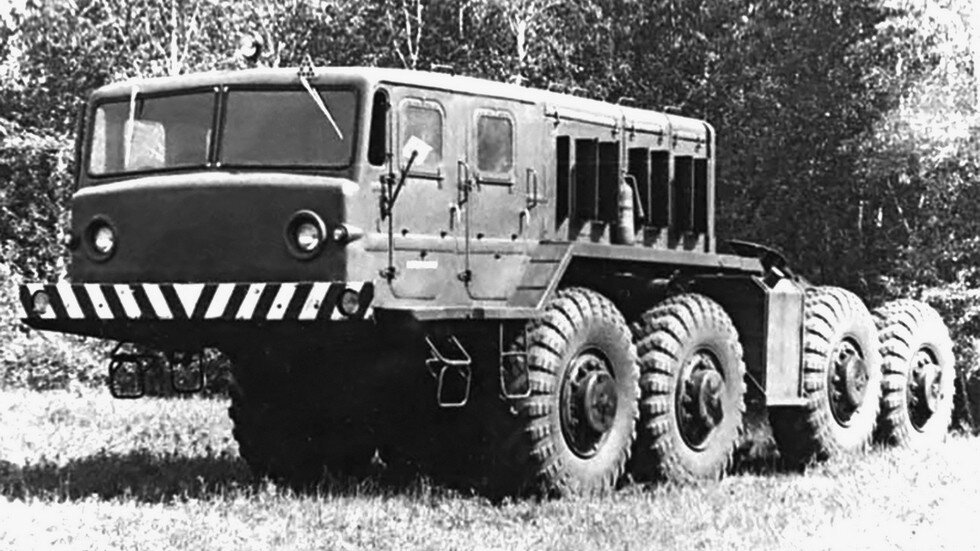 В 1969 – 1970 годах КЗКТ собрал два первых опытных тягача – седельный МАЗ-545 и балластный МАЗ-545А, базировавшиеся на шасси МАЗ-537. Новая цельнометаллическая 4-дверная 8-местная кабина появилась только в 1973 году. Она представляла собой удлиненную стандартную конструкцию от модели 537, вынесенную на увеличенный до 3 м передний свес рамы и оборудованную двумя парами боковых дверей с металлическими лесенками. К середине 1970-х она была преобразована в усиленный герметизированный вариант с дополнительной защитой от оружия массового поражения и плоской передней стенкой с обратным углом наклона, что привело к появлению короткого полукапота под двухсекционным лобовым стеклом. Поздний вариант получил плоский вертикальный передок-ограждение с приваренными усилительными косынками, за которым просматривалась обычная штатная кабина. Она имела два ряда по четыре индивидуальных одноместных сиденья, один люк в крыше и второй в задней стенке для доступа к двигателю. Главные технические особеннос