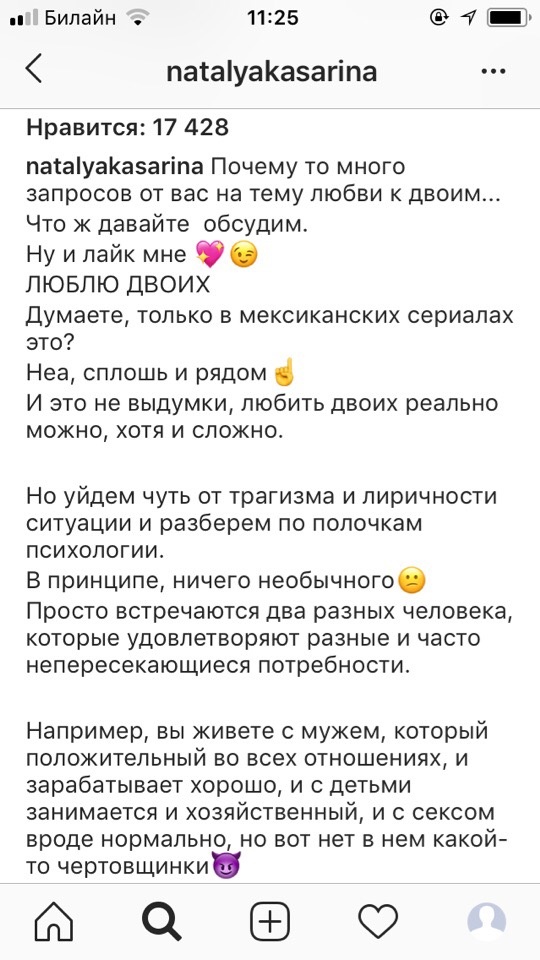 Вчера в Instagram известный сексолог разместила скандальный пост про любовь к двоим. Полный текст ниже, а краткое содержание таково: Если любишь мужа, но сводит мышцы внизу живота при виде кого-то еще, разделяй себе сексуальную и семейную жизнь и будь счастлива. Как видите, 17428 человек поддержали эту точку зрения. Надеюсь, вы не увидите в их числе свою вторую половинку... Конечно, большинство в комментариях справедливо возмутилось и призвало "специалиста" к конструктивному диалогу, но она оперативно блокировала неугодных. В итоге комментарии выглядят так, будто все читатели разделяют точку зрения сексолога. И от этой пропаганды весьма свободных нравов лично мне становится страшно. На страницах, сексологов, психологов и других специалистов оказываются потерянные люди, которые нуждаются в том, чтобы им помогли разобраться в собственных эмоциях. Но вместо этого им открыто говорят: "Да все ОК! Просто изменяй мужу и не парься". Хотите мое мнение психолога, что делать на самом деле, если