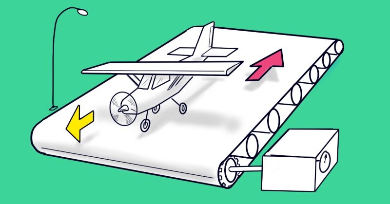 Сама задача звучит просто, собственно все хорошо видно на картинке. Но для тех кто вдруг, первый раз о ней слышит, повторю условия. Самолет ( любой реактивный или винтовой) стоит на конвейерной ленте. Лентой управляет автоматическая система управления и ее скорость всегда равна скорости вращения колес самолета. Вопрос взлетит ли самолет с конвертера или нет? Более десяти лет эта задача бродит по сайтам и форумам в интернете и постоянно вызывает бурные дискуссии. Казалось бы за это время должно быть решения найдено, Но... Я знаком с этой задачей с 2000 года. И уже тогда было понятно, что лучше про эту задачку не упоминать в кругу своих коллег. Каким то неведомым образом она вызывает у всех очень бурную реакцию. Коллектив мгновенно делится на тех кто утверждает что самолет взлетит и на тех кто это напрочь отрицает. И если по началу спорящие пытаются как то научно аргументировать свою точку зрения то буквально через десять минут в ход идут упрощенные варианты. Типа Сам дурак. Т