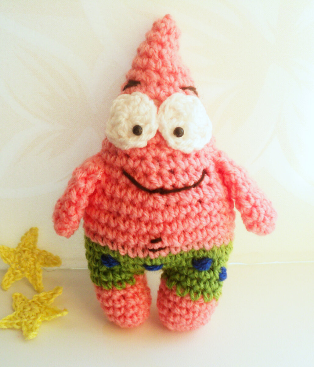 Для вязания игрушки потребуется: 1. «Детская новинка» розового, зеленого, синего, белого цвета; 2. Нить мулине коричневого цвета; 3. Синтепон; 4. 2 бусинки черного цвета. Сначала мы свяжем 2 ножки, а потом соединим их вместе и перейдем к вязанию тела. Делаем скользящую петлю и вяжем внутрь по принципу амигуруми 6 стбн. Дальше нужно прибавить через 1 петлю. Это будет 9 петель. Затем вяжем 1 ряд без прибавок. Далее прибавим через 2 петли. И еще ряд без прибавлений. Теперь меняем нитку на зеленую. Будем вязать штанишки. Провяжем 1 ряд без прибавлений. Свяжем еще 1 такую же деталь. От первой ножки нить отрезаем, а от второй нет. Делаем 3 вп и провязываем 1 стбн в любую петлю первой детали. Дальше вяжем по кругу. В том числе нужно выполнять по 1 стбн в петли цепочки с 2-х сторон. В 2 новых рядах нужно вязать по 2 стбн в боковые петли и в центральные петельки с обеих сторон. То есть прибавляем в 4 местах друг напротив друга. Затем свяжем ряд без прибавлений и сменим нить обратно на розовую.