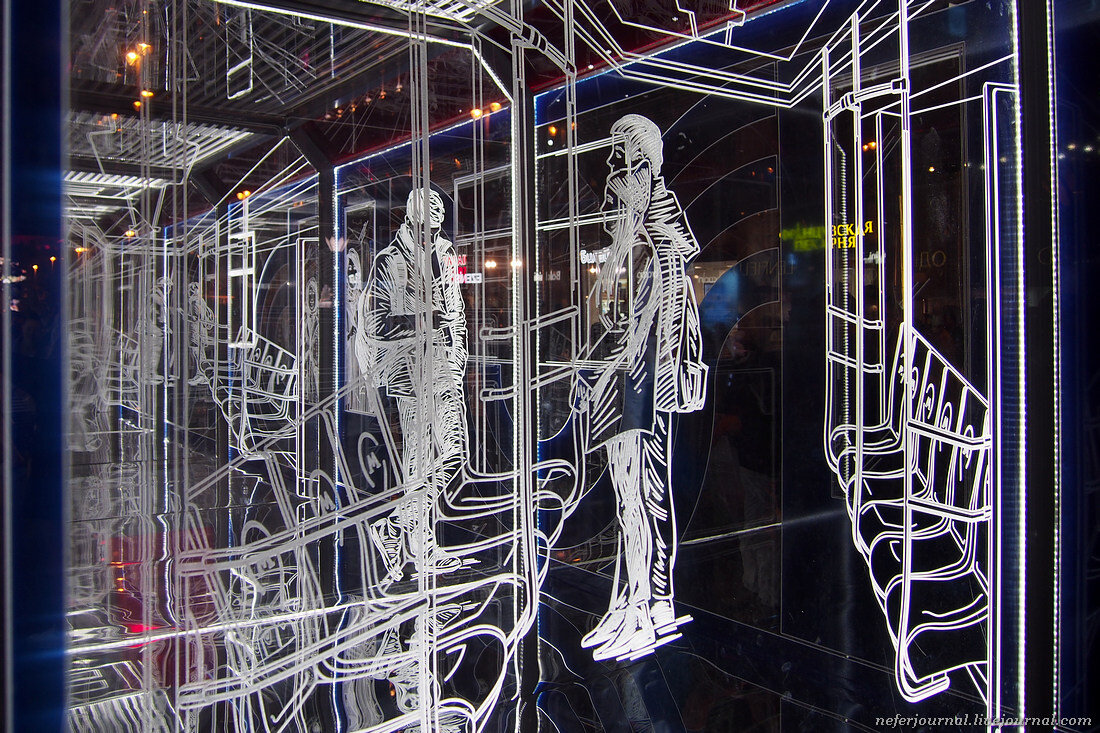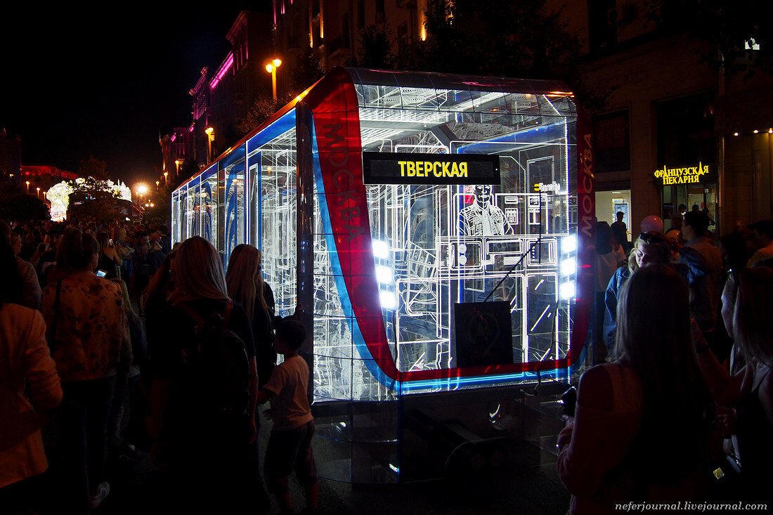 На улице установили арт-объекты, с подсветкой очень красиво. Можно сфотографироваться с артистами, послушать джаз или поколбаситься с танцорами. Каждый участок посвящен определенному виду искусства или исторической эпохе Москвы.