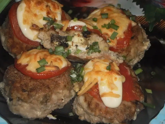 из куриного мяса, грибов,сыра,майонеза и помидор.