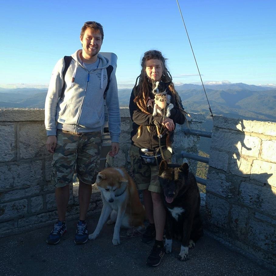 Сегодняшний день был полон приключений!🙌 Сразу после утренней прогулки по парку мы всей семьёй поехали к горе Ахун. А именно, к её высшей точке - Большой Ахун, которая на 663 метра возвышается над уровнем моря!😮 На вершине этой горы стоит тридцатиметровая смотровая башня из тёсаного белого известняка. Туда-то мы и решили забраться с нашими усатыми ребятами🐶⬆😂