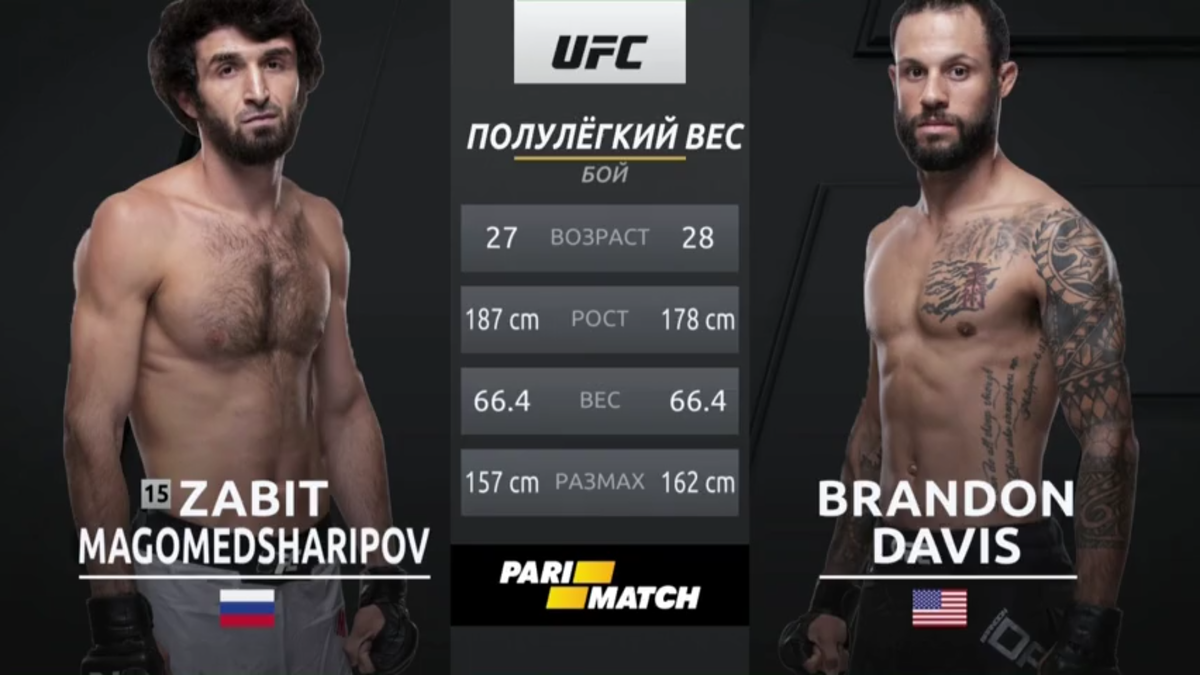 09.09.2018 в Далласе (США) прошёл очередной турнир UFC-228, на котором в бою встретились россиянин Забит Магомедшарипов (15-1) и американец Брендон Дэвис (9-4). И вот как прошла эта встреча: 1 раунд. Бойцы сходятся в центре октагона и приветствуют друг друга. Они присматриваются друг другу. Лоукик от Дэвиса. Много обманных движений. Снова лоукик от Дэвиса. Забит отвечает своим лоукиком. Россиянин меняет стойки. Двоечка от Брендона, но мимо цели. Забит не спешит отвечать на осторожные атаки соперника и показывает хорошую реакцию и работу ног. Очень много ударов Дэвиса приходится по воздуху. Бэкфист от Забита по защите Дэвиса. Американец много пытается выбрасывать ударов, но почти все они проходят мимо россиянина. Неудачная попытка подсечки от Магомедшарипова. Дэвис работает первым номером. У клетки Забит хорошо уклоняется от ударов оппонента и затем хорошо пробивает левой рукой. Два джеба от Забита доходят до головы Брендона. 3 лоукика от Дэвиса. Забит совсем непривычно смотрится, ко