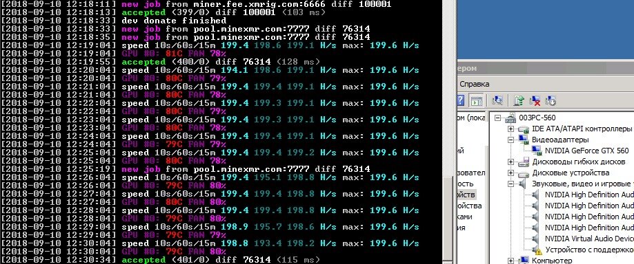 GTX 560 была куплена на авито за 500 рублей, продавец сразу предупредил, что она перегрета, но работает. Купил, поменял термопасту, снизил частоту gpu и памяти -50 и -70 соответственно и получилось 199 H\s на монеро стабильной работы.