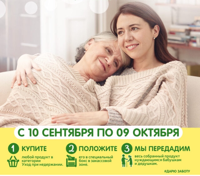С 10 сентября по 9 октября в 50 магазинах сети супермаркетов «Перекресток» в Москве и Санкт-Петербурге пройдёт благотворительная акция «Ваша любовь - в вашей заботе». Покупатели смогут на месте приобрести и сразу передать необходимые для пожилых людей товары. Акция приурочена к Международному дню пожилого человека, который отмечается 1 октября. Мероприятие организовано благотворительным фондом «Старость в радость». Идейным вдохновителем акции выступает компания Essi Принять участие в акции может любой желающий. Для этого необходимо: ✅ Купить в одном из 50 магазинов сети супермаркетов «Перекресток» в Москве или Санкт-Петербурге любой товар в категории «уход при недержании» ✅ Опустить товар в специальный бокс, установленный в закассовой зоне Собранные во время акции товары будут отправлены подопечным домов престарелых. Более подробную информацию об акции и адреса участвующих магазинов можно узнать на сайте фонда. Расскажите об акции друзьям. Вместе мы сможем сделать жизнь бабушек и дедуш