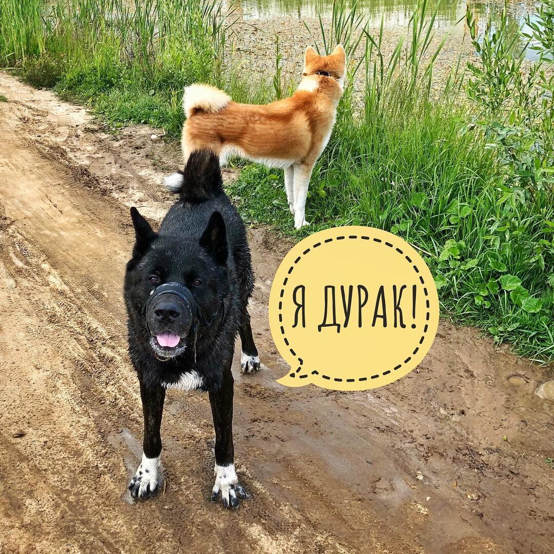 Одним прыжком занырнул в местную грязелужу, превратившуюся от времени в болото, за офигевшей от вида огромных псин уткой)) Но утка-то хоть и обсерилась, но шустро взлетела и была такова. А лопух Мурыч моментально с ушами ушёл под воду!🤣 Я даже рявкнуть не успела!))) Чёрный не ожидал, что там такая глубина (да и я тоже), поэтому после своего манёвра моментально обсерился и погрёб к берегу😂