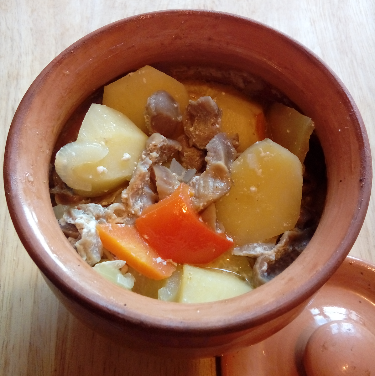 Нежное, сочное и сытное блюдо на 100 рублей... Как известно, желудки птицы состоят в основном из мышечной массы и в них отсутствует жир, что делает их привлекательными для низкокалорийного питания. Ингредиенты на 4 горшочка: куриные желудки - 300 гр. картофель - 4 шт. (крупный) морковь - 1 шт. лук - 1 шт. перец сладкий - 2 шт. растительное масло - 2 ст. ложки сливки - 4 ст. ложки (можно заметить сметаной) соль, специи Желудки курицы промыть, при необходимости очистить от желтых пленок. Порезать каждый желудок на 3-4 части длинными полосками, как на бефстроганов. Поставить отвариваться в небольшом количестве воды 30 минут. Важно: желудки при варке могут иметь специфический запах дикой птицы, особенно в начале, но это нормально. В готовом виде будет приятный мясной запах и вкус. Тем временем подготовить овощи: лук, морковь, перец и картофель порезать в произвольном порядке. С желудков слить воду, объединить с овощами, добавить растительное масло, соль и специи. Все перемешать и разло