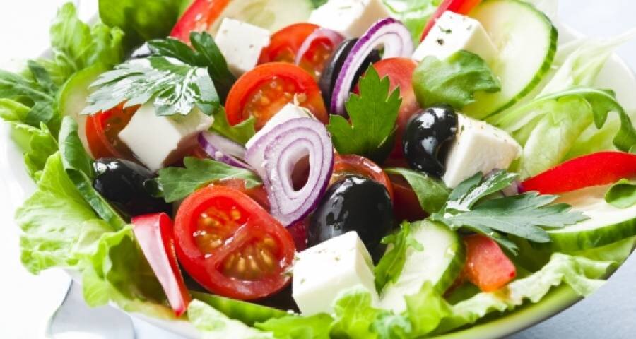 Греческий салат — один из самых популярных и вкусных салатов в мире. Чтобы приготовить 400 грамм (2 порции) греческого салата, нам понадобятся: баночка сыра «Фета», баночка чёрных маслин, 100 грамм оливкового масла Extra Virgin, пучок листьев салата, 2 средних помидора, один огурец и один болгарский перец. Специи для греческого салата включают в себя соль, перец, базилик и орегано. Рецепт классического греческого салата предполагает крупную нарезку овощей кубиками. Старайтесь нарезать помидор примерно на 15-20 частей. Кубики огурца должны быть чуть крупнее одной маслины. Сыр нарезается чуть мельче, кубиками примерно в 1 см высотой. Маслины разрезаем на 2 половинки. Тщательно перемешиваем, обязательно выжидаем 20-25 минут, чтобы наш греческий салат пропитался маслом, а затем подаём к столу! Приятного аппетита!