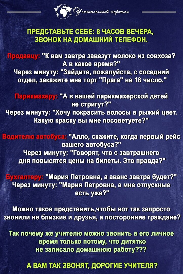 Вот эта картинка из группы "Типичный учитель" так живенько напомнила мне звонки от родителей. Вопросы были самые разные: "А что вы задали по русскому? А подскажите, как выполнить вот это задание? А стихотворение учить все? Ого, как много!" Ну и так далее. И эти звонки в эпоху мобильников могут раздаваться в 7 утра, в 9 вечера, в выходные, в отпуске, на каникулах. И почему-то родители считают, что учитель должен помнить все домашние задания всех классов. А если учитель работает во всех параллелях? Особенно если в школе только один класс в параллели? А если еще ведет не один предмет, например в малокомплектной школе? Учитель должен помнить все ДЗ, все оценки по всем предметам своих учеников. За что и когда поставил оценку. А если не помнит, то как же так? А как у вас, коллеги? Родители вам звонят в любое время дня и ночи? Или какие-то рамки вы им ставите? Поделитесь, как решаете такие ситуации? Я вспоминаю благословенные советские времена, когда и стационарный телефон не у всех-то был.