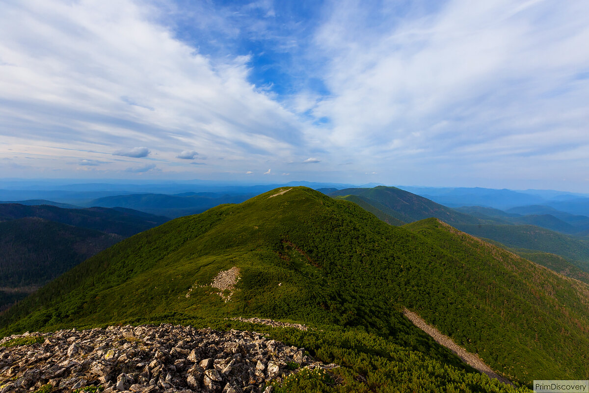 Оставалось только сфотографировать окружающую красоту и можно было начинать спуск. Прямо перед нами, напротив вершины, наблюдалось настоящее чудо - зарождались грозовые тучи. Два течения воздуха встречались на Сихотэ-Алине и образовывали настоящее облако!