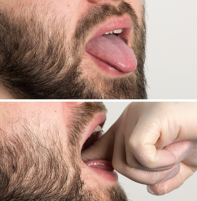 Откройте рот и покажите свой язык. Используйте указательный палец для достижения корня языка (на уровне зубов мудрости) и слегка нажмите его. Затем массивные круговые движения попеременно увеличивают и уменьшают давление на область языка в направлении подбородка.