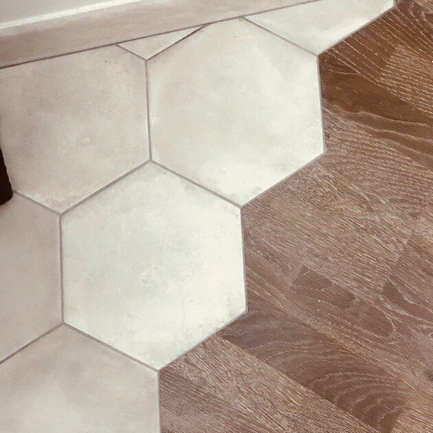 Чтобы разделить жилое помещение на функциональные зоны, в нём зачастую совмещают напольные покрытия — например, ламинат и кафельную плитку. Поговорим о том, как соединять подобные материалы грамотно.