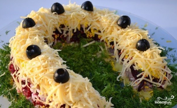 3. На мясе сделайте сеточку из майонеза. Сверху выложите тертую на крупной терке отваренную свеклу.